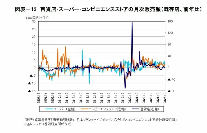 12月単月でみると、百貨店が▲1.0%(マイナス反転)、スーパーが+0.4%(14カ月連続のプラス)、コンビニエンスストアが+1.1%(10カ月連続のプラス)となっている。