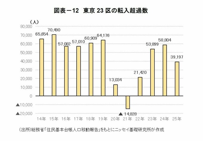 一方、総務省によると、東京23区における転入超過数は2025年10-12月累計で▲4,952人、2025年累計では39,197人とプラスを維持したものの前年比▲33%減少した。