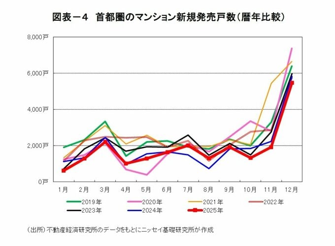 不動産経済研究所によると、2025年12月の首都圏のマンション新規発売戸数は5,468戸(前年同月比▲6.0%)と3カ月連続で減少し、10-12月累計では8,694戸(前年同期比▲12.0%)と再び減少に転じた。