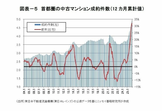 東日本不動産流通機構によると、首都圏の中古マンション成約件数は10-12月累計で12,632件(前年同期比+33.6%)と5四半期連続で増加し、2025年累計では49,114件(前年比+31.9%)と3年連続で増加した。