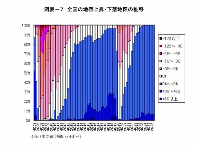 地価は、住宅地・商業地ともに上昇している。国土交通省の「地価LOOKレポート(2025年第3四半期)」によると、7四半期連続で全ての地区(全国80地区)が上昇となった。