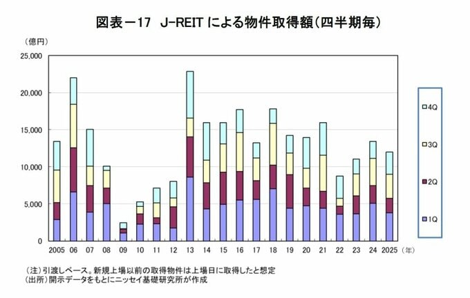 J-REITによる第4四半期の物件取得額(引渡しベース)は2,988億円(前年同期比+29%)、2025年累計では1兆1,996億円(前年比▲11%)と3年連続で1兆円を上回った。