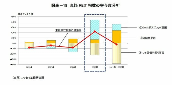 2025年の東証REIT指数は+21.8%となり、4年ぶりの上昇となった。2025年の上昇率について、①分配金、②10年国債利回り、③イールドスプレッド(リスクプレミアム-期待成長率)の3つの要因に分解して寄与度を確認すると、①分配金の増加で+7%、②10年国債利回りの上昇(1.1%→2.1%)で▲22%、③イールドスプレッドの縮小(4.0%→2.4%)で+37%となった。