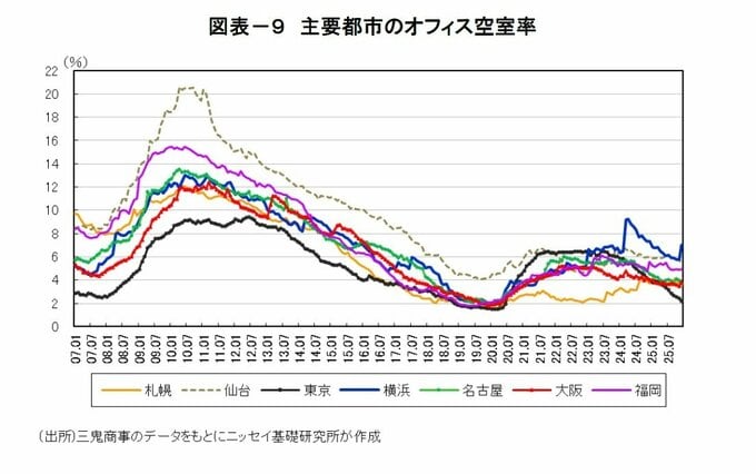 今後の見通しについては、2026年の新規供給(52.4万坪)が過去10年平均(53.6万坪)を下回る見込みであるが、これまでに積み上がった空室在庫の影響により、空室率の低下は緩やかなものにとどまるとのことである。
