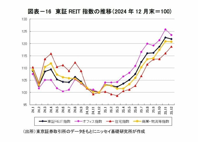 2025年第4四半期の東証REIT指数(配当除き)は9月末比+4.8%上昇した。業種別では、オフィスが+3.6%、住宅が+4.5%、商業・物流等が+5.9%となり全て上昇した。