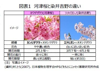 染井吉野はエドヒガン(以下、江戸彼岸)と大島桜の交雑種であるのに対し、河津桜は寒緋桜を親種に持つ。そのため、遺伝的な特徴や開花のしかたに違いがあり、花色、開花時期、開花の進行・期間といった特徴が差として現れている。