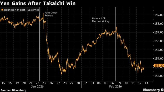 (ブルームバーグ):外国為替市場では円の対ドル相場が週間ベースで2024年11月以来の大幅高を記録する勢いだ。衆院選で高市早苗首相率いる自民党が勝利し、財政政策を巡る懸念が和らいだことが背景にある。