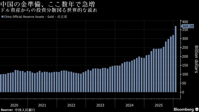 中国政府はこの10年、金の保有を積み増してきた。25年には購入を大幅に加速した。ただ、金以外では、約3兆4000億ドルと世界最大規模の外貨準備を運用する上で有力な代替投資先はほとんどない。中国国内の銀行も同様の問題に直面している。