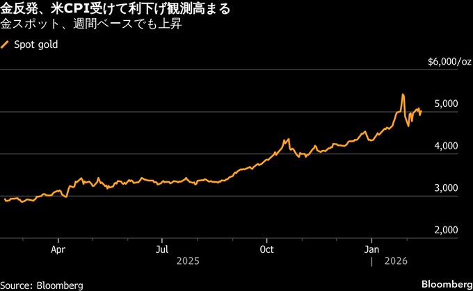 金スポット相場は反発。1月の米CPIを受けて、利下げ観測が高まったことが背景。金利低下は通常、利回りを生まない金への追い風になる。また前日の急落を好機とみて、押し目買いに動く投資家もいた。