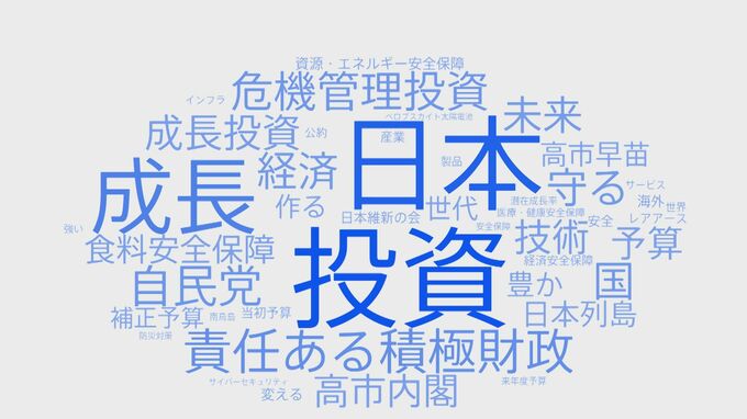 高市総理が選挙期間におこなった街頭演説をAIを使って分析すると「日本」「投資」「成長」「未来」などといった言葉が多く使われていたことが分かる。また「人を動かすのは希望だ」と訴えるなど、明るく前向きなメッセージを発信し続けた。