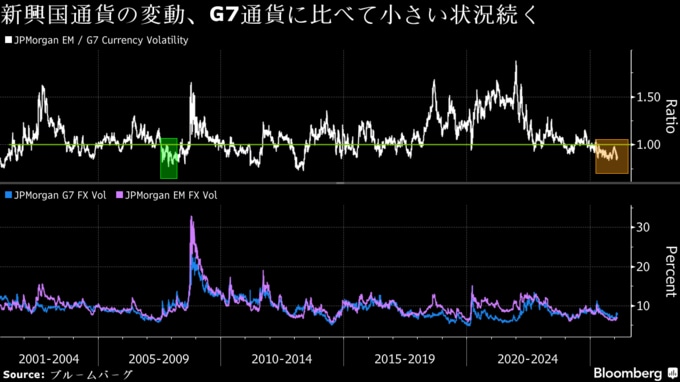 JPモルガン・ボラティリティー指数によると、新興国通貨の変動が主要7カ国(G7)通貨に比べて小さい状況が200日近く続いており、2008年以来の長さとなっている。208日を超えれば、00年までさかのぼるデータで最長を更新する。