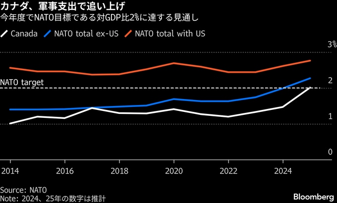 カナダは強硬な米政権や北極圏におけるロシアの活動への懸念の高まりを背景に、数十年ぶりとなる規模の軍事強化に着手。北大西洋条約機構(NATO)の支出目標で後れを取ってきたカナダは、軍事費の増額を急いでいる。NATO加盟国は2035年までに防衛・安全保障費の対国内総生産(GDP)比を5%に引き上げることで合意している。