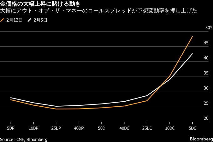 ステート・ストリート・インベストメント・マネジメントの金・金属戦略責任者、アカーシュ・ドーシ氏は「テクニカルな調整の後にもかかわらず、これほど大幅にアウト・オブ・ザ・マネー(現時点では利益が出ない行使価格)のコールスプレッドにこれだけの建玉があるのは驚きだ」と述べ、「一部のトレーダーは割安な宝くじのようなものと見なしている可能性がある」と指摘した。