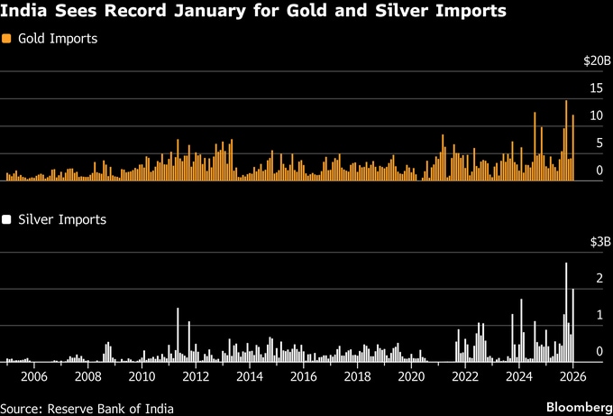 インドの輸入統計によると、1月の金および銀の輸入額は記録的水準に迫った。金輸入額は120億ドル超と、月間としては過去3番目の高水準を記録した。