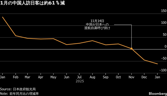 (ブルームバーグ):日本政府観光局(JNTO)は18日、1月の訪日外客数が前年同月比4.9%減の359万7500人だったと発表した。新型コロナウイルス禍の水際対策が全面的に解除された2023年4月以降で初めて前年同月比でマイナスに転じ、急成長してきたインバウンド市場に変化の兆しが現れた。