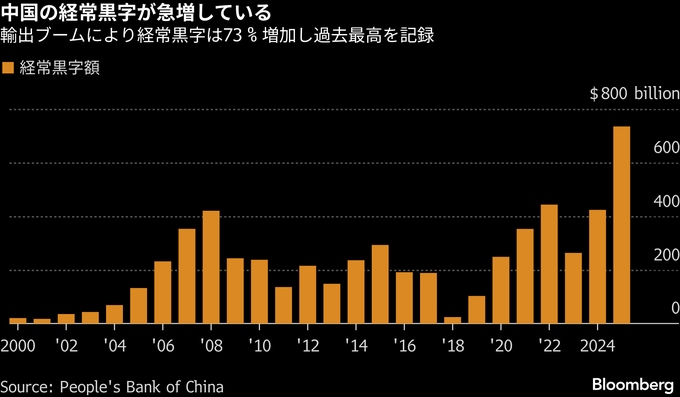 先週公表された速報値に基づくブルームバーグの試算では、昨年の経常黒字はGDP比3.7%に達している。貿易黒字が過去最高の1兆2000億ドル(約185兆円)に膨らんだことが主因だ。ゴールドマンのエコノミストは、中国の黒字が早ければ3年以内に世界のGDPのほぼ1%に達し、「記録上、いかなる国よりも」最大になると予測している。