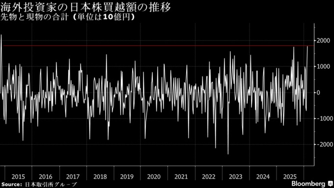 (ブルームバーグ):衆議院選挙での与党圧勝を受けた国内政治の安定や高市早苗首相の財政拡張への期待から、海外投資家の日本株買いが加速している。
