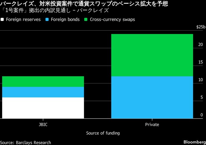 バークレイズのリポートは、「日米投資の第1号案件は150億ドル程度の中長期ドル/円ベーシス受け需要につながる可能性がある。ただ、実際の通貨ベーシスへの影響を巡る不確実性は大きい」と指摘。