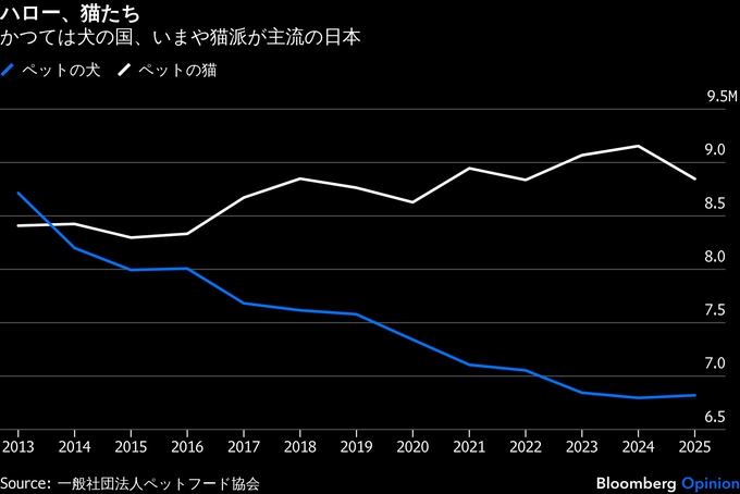 筆者は昔から猫派だが、約25年前に日本にやって来たばかりのころは、明らかに犬の方が人気だった。なんといっても、日本は亡き主人の帰りを10年にわたり渋谷駅で待ち続けた「忠犬ハチ公」の国だ。ペットショップの棚は犬向け商品がはるかに多く、海外メディアは少子化と結び付けて甘やかされた犬を取り上げる報道に熱中していた。