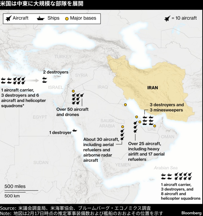 米国防総省は空母2隻や戦闘機、空中給油機を含む大規模な部隊を同地域に展開しており、トランプ氏はイランに対して限定的、あるいは長期的な作戦を開始する選択肢を手にしている。