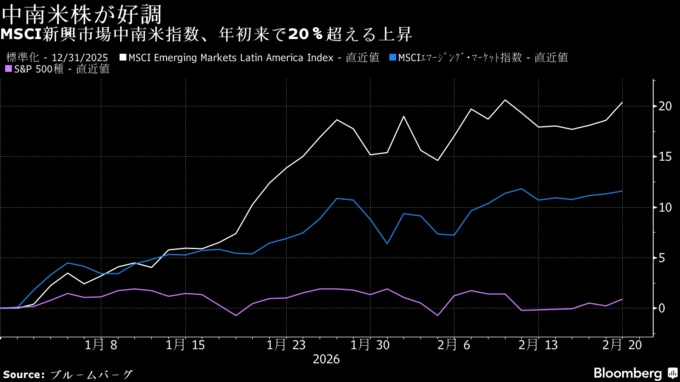 ブラジルやコロンビア、メキシコの株式市場では海外勢の買いが急増し、MSCI新興市場中南米指数が11年ぶりの高値を付けた。2026年に入ってからの上昇率は20%を超え、年初としては1991年以来の好スタートだ。