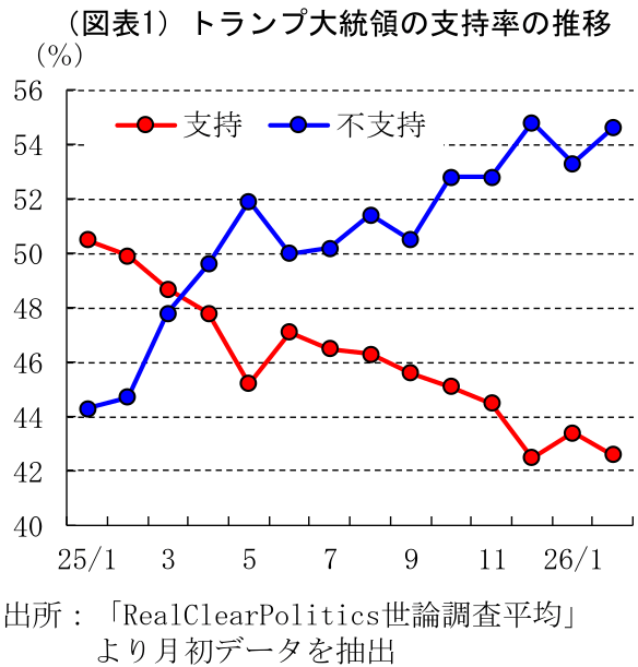 トランプ大統領(二期目)の支持率は、就任直後こそ50%を上回っていたものの(支持率データはRealClearPolitics世論調査平均による:以下同)、その後は物価高対策が進まないことなどもあって一貫して低下基調を辿っているが、ICEによる発砲死亡事件には、党派を超えた批判も多い。