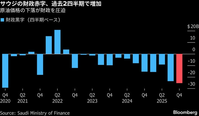 (ブルームバーグ):サウジアラビアの財政赤字は2025年10-12月(第4四半期)に拡大し、過去5年で最大となった。原油価格の下落が財政を圧迫している。