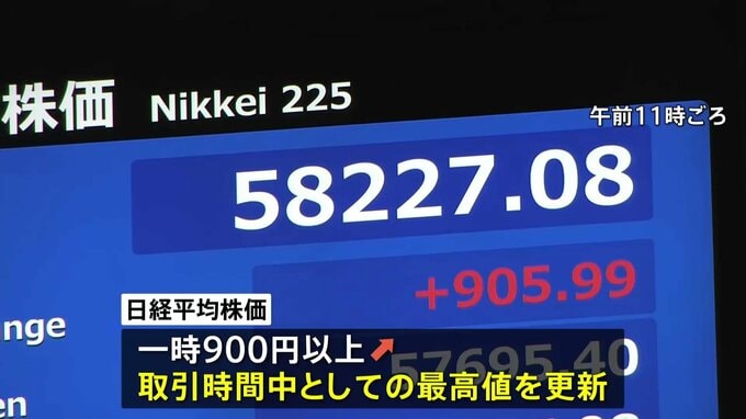 日経平均株価が取引時間中の最高値を更新し、5万8000円台を回復しました。きょうの日経平均株価は一時、900円以上値上がりし、取引時間中としての最高値を更新しました。5万8000円台をつけるのは、今月12日以来お…