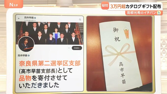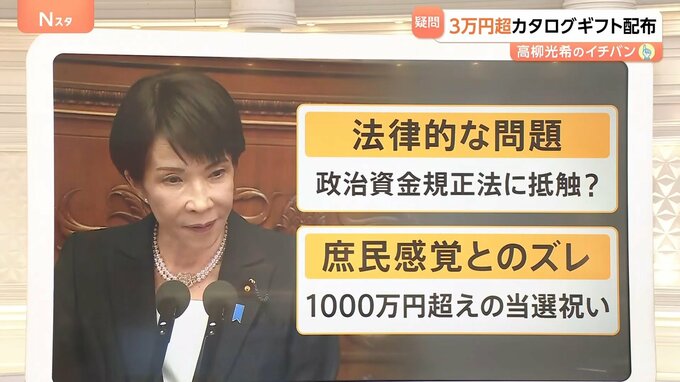 高市総理が当選祝いとして3万3390円のカタログギフトを配ったことについて、▼「法律的な問題」、▼「庶民感覚とのズレ」、この2つの視点でみていきます。
