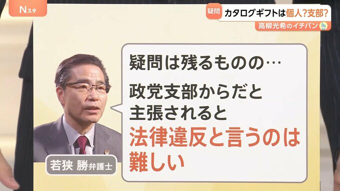 若狭勝弁護士によると「疑問は残るものの、政党支部からだと主張されると法律違反と言うのは難しい」と話しています。