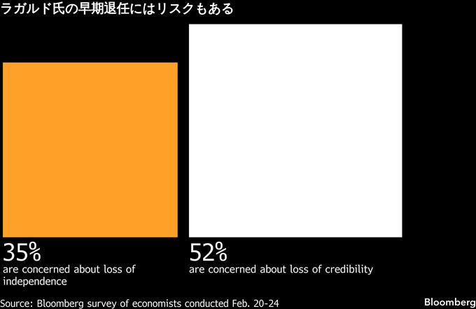 ベルリン工科大学国際経営学部のデニス・シェン講師は「ラガルド氏の早期退任は、ECBが政治的に完全には独立していないという明確なシグナルとなる」としたうえで、「フランスの極右勢力がラガルド氏の後継者選定に関与するシナリオは、同氏の早期退任よりも、ECBの独立性にとって有害になり得る」と述べた。
