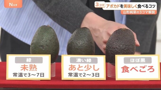 まずは色で見分けることができ、▼緑色のアボカドはまだ熟していないので、常温で3日〜7日置くと食べごろになります。▼濃い緑のアボカドは常温で2〜3日置くと熟し、▼ほぼ黒になっているアボカドは食べごろということです。