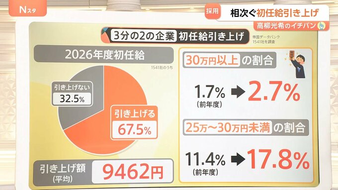 帝国データバンクの調査では、大企業や中小・小規模企業を含む1541社のうち67.5%が「初任給を引き上げる」と回答しました。引き上げ額は「9462円(平均)」と1万円に迫る勢いです。