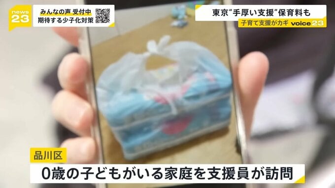 品川区では、0歳の子どもがいる家庭を支援員が訪問。おむつなどを無料で届ける独自のサポートを行っています。