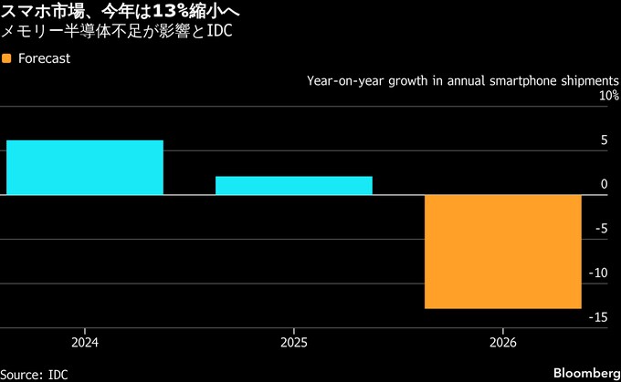 (ブルームバーグ):世界のスマートフォン市場は2026年に12.9%縮小する見通しだ。調査会社IDCが示した。メモリー半導体の供給不足を背景に、「かつてない危機」に直面しているとしている。