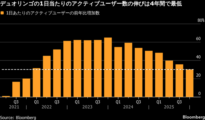 デュオリンゴの25年10-12月(第4四半期)の調整後EBITDAは8430万ドルとなり、市場予想平均の7790万ドルを上回った。一方、1日当たりアクティブユーザー数は前年同期比30%増にとどまり、過去4年間で最も低い伸びとなった。