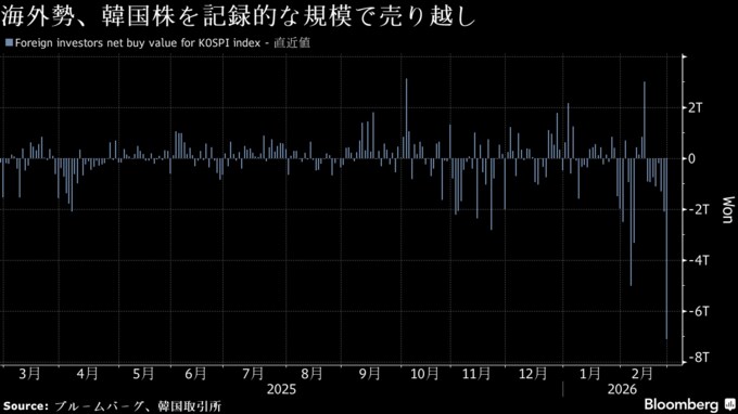 (ブルームバーグ):グローバル投資家が27日、韓国株を記録的な規模で売り越した。今年に入り50%近く上昇しており、利益を確定する動きとみられる。