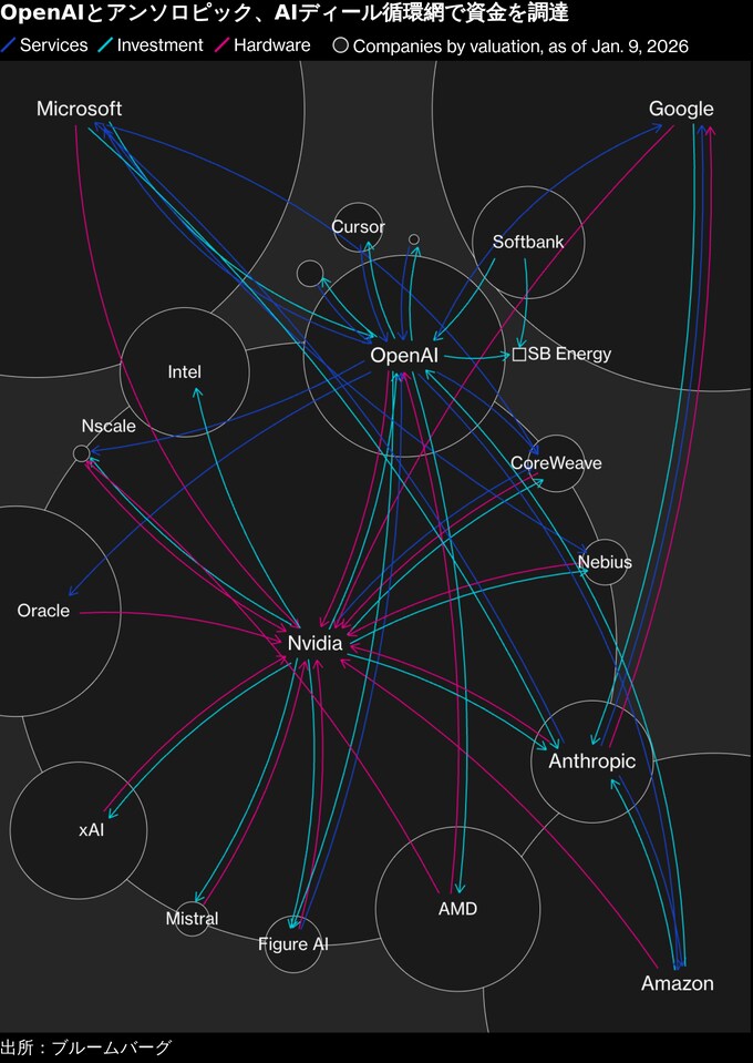 OpenAIだけでなく競合のアンソロピックも、自社のAIソフトウエアを支える半導体およびデータセンターに巨額の投資を計画し、そのための資金調達を今年加速させている。両スタートアップ(新興企業)の投資家グループには、エヌビディアやマイクロソフトなどが重複している。