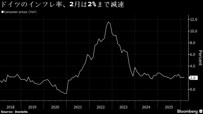 (ブルームバーグ):ドイツのインフレ率は2月に予想外に低下し、欧州中央銀行(ECB)が目標とする2%を付けた。