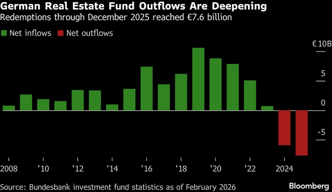 ドイツのオープンエンド型不動産ファンドでは解約が加速しており、ドイツ連邦銀行の最新データによれば、昨年は76億ユーロの純流出。約20年ぶりに資金流出が流入を上回った2024年をさらに上回る規模となった。