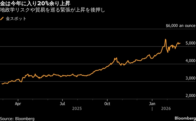 金は今年に入り20%余り上昇している。1月下旬の最高値から急落した後、再び1オンス=5000ドルを上回る水準を回復した。月間では7カ月続伸となる見通しで、実現すれば1973年以来の長期上昇局面となる。