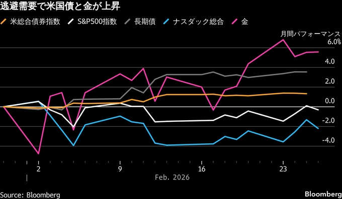 米国債相場は1カ月続いた上昇基調を一段と強めた。AIの破壊的かつディスインフレ的な影響を示す動きや、地政学的緊張の高まり、プライベートクレジット市場での不安などが背景にある。