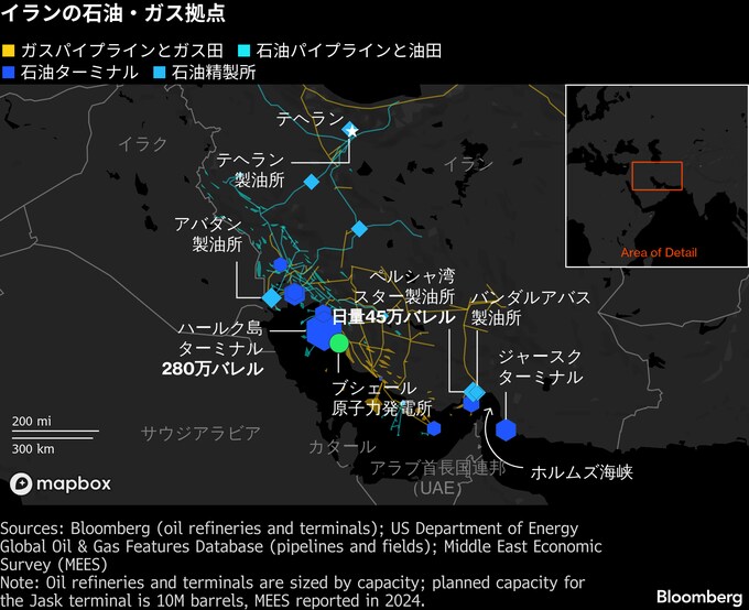 イランの原油輸出は、ペルシャ湾北部のハールク島ターミナルを主力拠点とする。メヘル通信は、ハールク島で28日に爆発があったと報じたが、詳細は伝えておらず、石油ターミナルについても触れなかった。