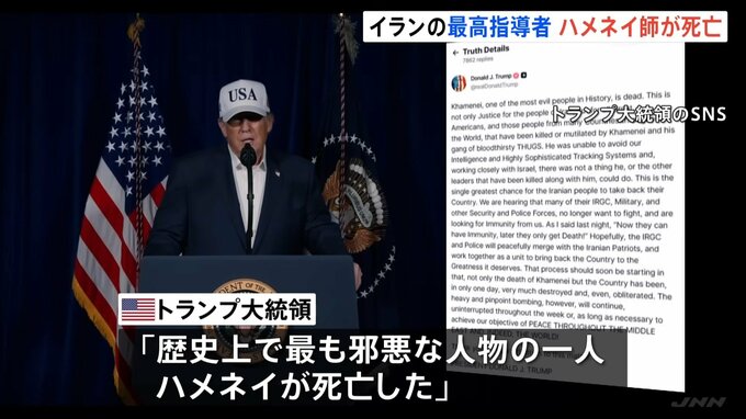 トランプ大統領は2月28日、イランの最高指導者・ハメネイ師について、「歴史上で最も邪悪な人物の一人、ハメネイが死亡した」とSNSに投稿しました。