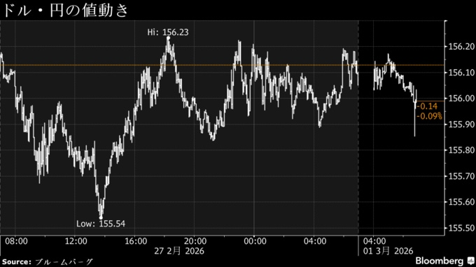 (ブルームバーグ):2日朝の東京外国為替市場の円相場は対ドルで156円台前半と前週末比でやや下落。中東情勢の悪化を受けた「質への逃避」でドルが急騰している。リスク回避で円も買われやすく、早朝時点でドル・円は小幅な動きにとどまっている。