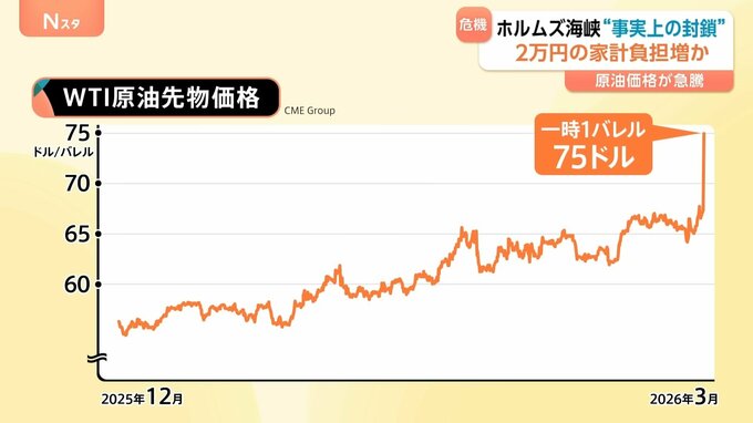 これまで1バレル60ドル台だった原油の先物価格は、けさ、一時75ドル近辺まで上昇。日本総研の栂野氏はホルムズ海峡の封鎖が続けば、最大で120ドル台まで上昇する可能性があると指摘します。