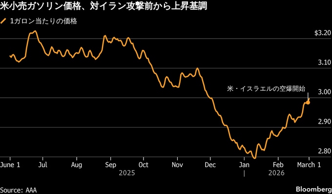 ガソリン価格は、これまでも景気に対する国民の見方を左右してきた。同価格が中東情勢の影響を受けやすいのは、世界で海上輸送される原油や天然ガスの約5分の1が、イランが通航を事実上握るホルムズ海峡を通過しているためだ。 米国とイスラエルがイランを空爆した2月28日以降、タンカーの往来は急減している。