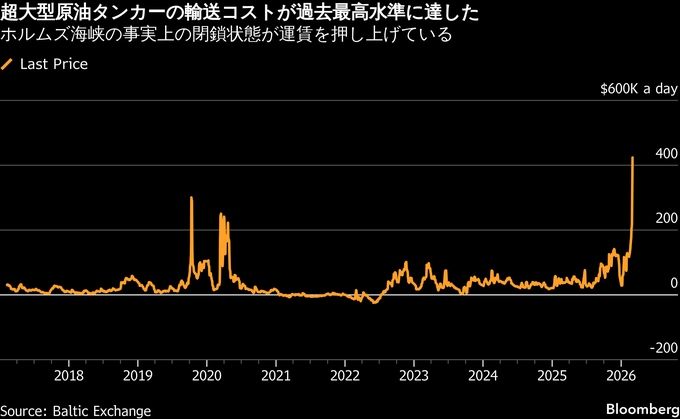 ロンドン・バルチック取引所のデータによると、業界の基準ルートにおける運賃は、1日あたり42万4000ドル(約6700万円)に上昇した。200万バレルの原油を輸送可能な最大級のタンカー(VLCC)に適用される価格だ。米国メキシコ湾岸から中国までのタンカー手配費用も、航海全体で2100万ドル超の過去最高を記録した。