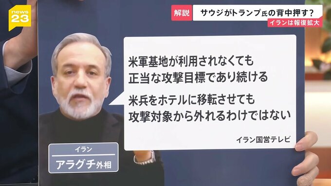 攻撃が広がる中、短期終息はあるのかという点ですが、イランのアラグチ外相は「米軍基地が利用されていなくても攻撃目標であり続ける。米兵をホテルに移転させても攻撃対象から外れるわけではない」とはっきり言っています。民間施設も狙って報復を続けるのでしょうか?