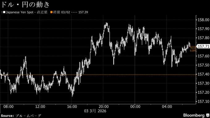 三井住友信託銀行ニューヨークグローバルマーケッツ部の山本威調査役は、リスク回避が続く中で「局面によってはドル買いが強まっている」とし、政府からのけん制がなければドル・円は158円を上抜ける可能性があると話した。一方、中東情勢の収束が見通せなければ米国経済への悪影響が意識され、相場が「逆回転」する可能性もあると言う。